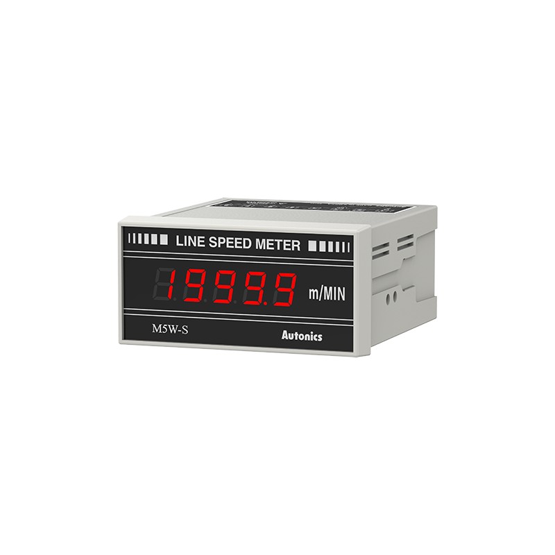 M5W-S-1 Medidor digital de velocidad para panel. Display de 4 dígitos con LED 4 y 7 segmentos. Tamaño DIN 72WX72Hmm, con profundidad de 111Dmm. Velocidad. Máxima señal de entrada: 0-10VCD/1999 m/min. Tensión de alimentación: 100/220VCA. Salida de control: Indicador.